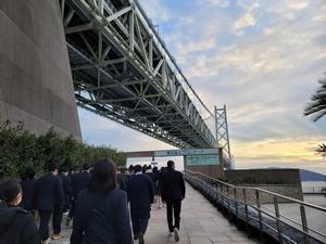 午後は世界一の吊り橋である明石海峡大橋を見学しました。橋の内部にある空中回廊を歩き、47メートルの高さを体感しました。