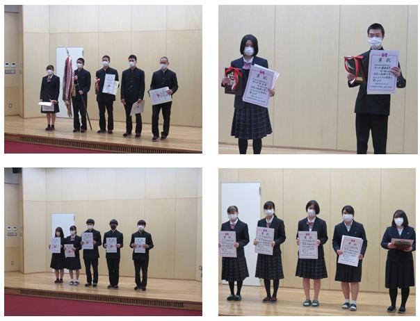 表彰伝達式及び2学期終業式がリモート方式で行われました。表彰伝達式では県新人大会で優勝した剣道部をはじめとして5つの運動部と6の文化部と個人参加(将棋)での入賞、読書感想文、高校化学グランプリの表彰がありました。