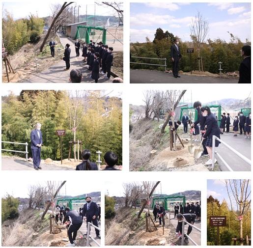 青木同窓会会長、正村校長のごあいさつの後、3年生の各クラスの同窓会幹事(各ホーム男女各1名)が「陽光桜」(ようこうざくら)1本を植樹しました。