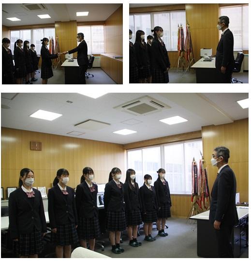 本日、校長室において、全国選抜大会(3/23~3/25、福岡市総合体育館)に出場する空手道部に対して、激励費が授与されました。