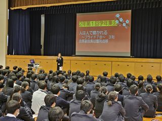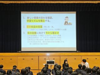 新学期が始まるにあたり、2学年では学年集会を行いました。まず最初に、杉本副校長先生をはじめとして各課の先生方から、2年生としての過ごし方のアドバイスをいただきました。