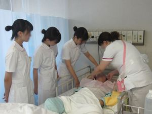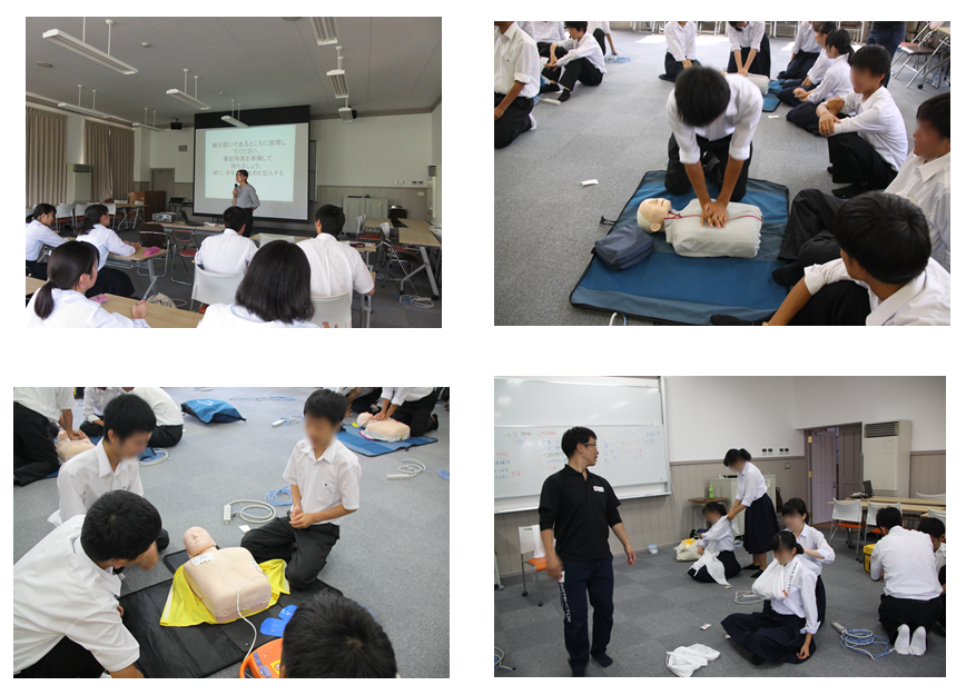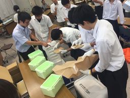 その後、日本赤十字社石川県支部から指導員をお迎えして、生徒対象の救急法講習会が行われ、心肺蘇生法からAEDの使い方、三角巾の使い方などを学びました。以前にも救急法の講習を受けた生徒もいましたが、その重要性と技術を再確認できました。