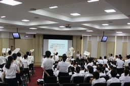 全体会では、学校概要の説明に続き放送部が製作したビデオ上演、生徒会によるクイズを交えた学校紹介を行いました。その後、部活動の体験や施設の見学を実施しました。