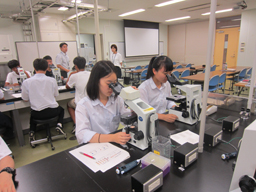 開講式のあと物理,化学,生物,地学の各体験セミナーに分かれ、高校のレベルを超えた講義を受け、先生や学生・院生の指導のもと実験を体験しました。