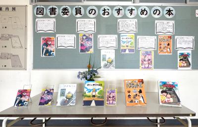 図書委員によるお勧めの本を児童玄関前に展示・掲示してあります。どのようなところがお勧めなのかのコメントもあり、読書意欲を高めてくれています。低学年向けのものから高学年、大人でも読みたくなる本がありました。図書委員会の皆さん、ありがとうございます。