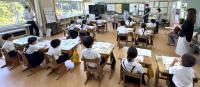 6日には3、4年生が、7日には1,2年生がモニターの向こうのネイティブの先生と英会話を楽しみました。英語活動や西北台シアター、イングリッシュデイで学んだ英語を使いながら、ジェスチャーも交えて笑顔でモニターの先生に英語で答えていました。