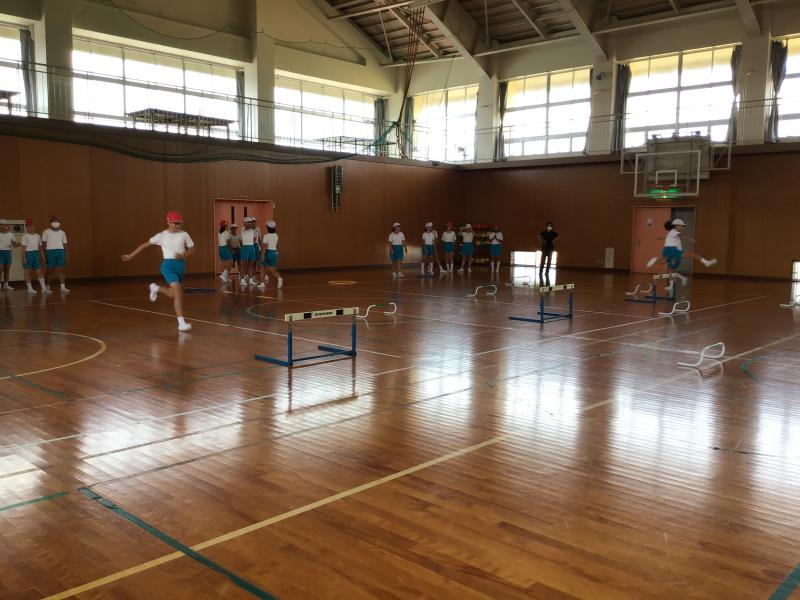体育の授業では,6年生と一緒にハードル走の練習にも取り組んでいました。