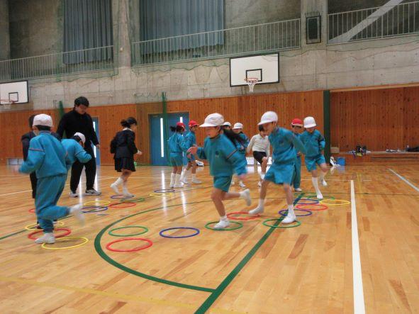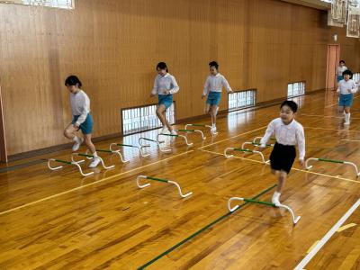 昨年度まではひたすら走っていましたが、今年度はひと工夫をしました。ミニハードルを並べて、リズミカルに越えていきます。