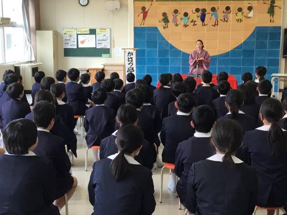 始めに、落語についての説明を聞きました。手ぬぐいや扇子を使って、いろいろな物を表したり、一人で何役もしたりすることを教えていただきました。次に、動物園を舞台にした現代落語を聞きました。子どもたちの明るい笑い声をたくさん聞くことができました。高学年の子どもたちが「寿限無」を披露する機会もあり、良い体験になったと思います。心が明るくなる楽しい時間になりました。