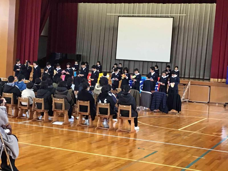 年末に届いた大谷翔平選手のグローブも紹介しました。このグローブを使って、元気に体を動かしたり、大谷さんからのメッセージにもあるように、夢や勇気を持ち続けることの大切さを感じたりしてほしいと思います。最後に、校歌をみんなで歌いました。
