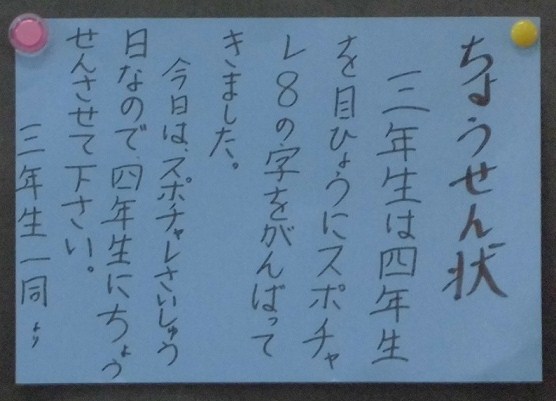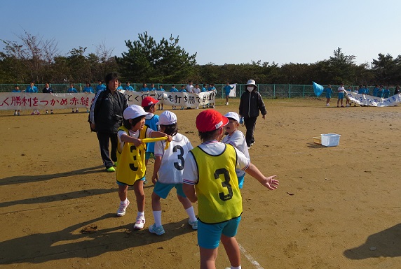 きょうえきでん大会をがんばったのがたのしかったです。いちばんがんばったところは,1年生がさきにはしって,つぎ黄色ぐみのひなこさんからたすきをもらって、だれかをぬかそうと思いました。おかあさんがおうえんしてくれて,いっしょうけんめい走ったら赤ぐみのすばるさんとゆのさんをぬかせたことがとてもうれしかったです。