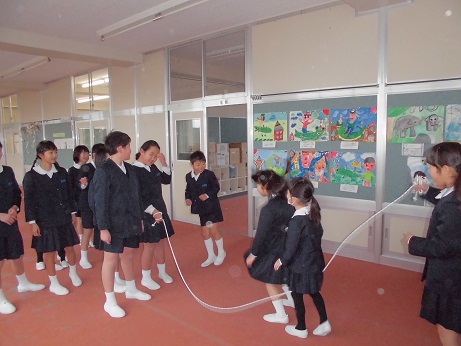 なわとび集会に向けて、長休みだけではなく朝休み、昼休みにも教室の外でなわとびをしている姿が見られます。