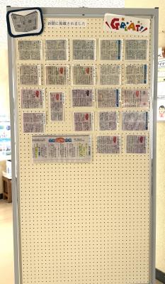今年度新聞に掲載された記事や児童の作品をランチルーム入り口の掲示版に掲示してきましたが、児童の頑張りで記事や作品が多くなり、掲載するスペースが埋まってしまいました。