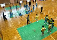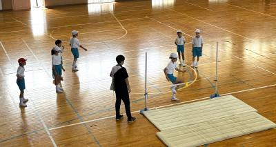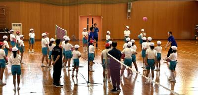 実技では、アンダーハンドパス、オーバーハンドパス、円陣パス、そして最後にスパイクを教えてもらい、うまくいったとき児童は満面の笑顔になっていました。全員が満足した様子でした。