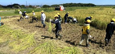 5月14日に植えた苗が立派に生長し収穫できるようになりました。まだまだ残暑厳しい陽差しの中、JAの職員の方にカマでの稲の刈り方やコンバインでの脱穀の仕方を教えてもらいながら、稲の収穫の体験をさせてもらいました。児童はカマの使い方も次第に上手になり、スパッと1回で刈り取ることができた時には、「やったー、できた!」と声を出して喜んでいました。
