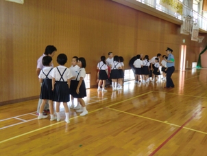 訓練の後は,体育館で羽咋警察署の中嶋さん,由井さんから,不審者に遭ったときの逃げ方や対応について学びました。また,不審者対応ロールプレイングとして,20mダッシュも行いました。最後は,一ノ宮駐在所の谷内さんから,交通安全についての話もありました。