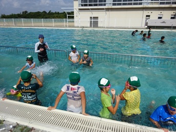 5年生が歓迎の言葉を言ったあと,年長さんをおんぶして深いプールを歩いたり宝探しをしたりと,様々なプログラムで一緒に楽しい時間を過ごしました。輪くぐりでは,最初できなかったけれどみんなに励まされてできるようになった園児もいて盛り上がりました。
