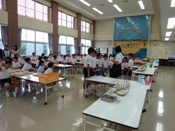 7月15日(水),2年生の畑で採れた野菜を使ってサラダを作りました。そして,野菜を作るときにいつもお世話になっている用務員の地家さんを招待して,「野菜パーティ」を開きました。