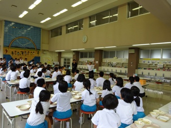 7月16日(木),チャレンジノートが2冊以上終了した3~6年生の児童に,自学の王様から賞状が届きました。そこで,給食の時間に食堂で校長先生が自学の王様からの賞状を代読し,児童に渡しました。