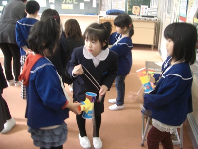 まずは、1年生が生活科で作った遊び道具