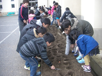花壇にチューリップの球根を植えました。