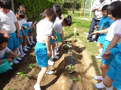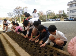 11月16日(水) 来年入学の園児を迎え、5年生(来年6年生)が一緒にチューリップの球根を植えました。お兄さん、お姉さんのやさしい言葉で、園児たちも笑顔がたくさん見られました。
