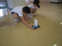 自分が作った車が、風の力でどれだけ進むか、グループのみんなと一緒に楽しく調べることができました。