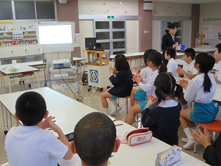 先生の出身地や好きなものを,子どもたちは興味深そうに聞いています。