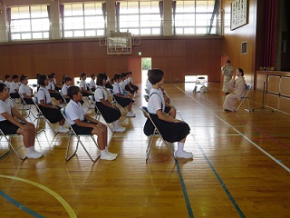 養護教諭の先生の話を真剣に聞いています。