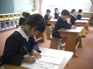さて、始業式の後、書き初め競書会が行われています。