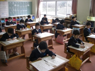 1・2年生は教室で、ペンを使って書きます。