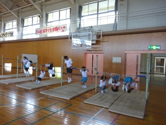 9月9日(水),体育館に鉄棒が設置されました。児童は,朝から鉄棒で様々な技に挑戦しています。鉄棒の設置期間は1週間ほどと短いですが,その間にできることが一つでも増えるとよいと思います。