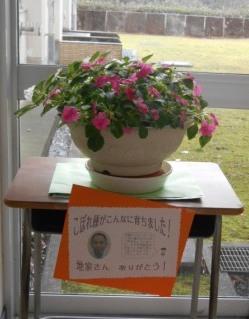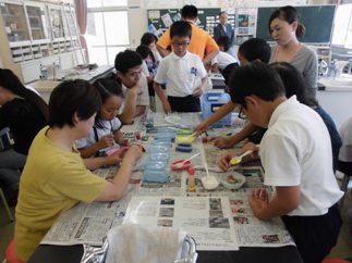 2月15日月曜日に行われる市内支援学級の「6年を送る会」で卒業生に贈るプレゼントを制作中です。製作しているのは花瓶です。紙粘土をペットボトル全体につけて,花瓶の形にします。次に卵の殻を利用して花のモザイクを貼りつけていきます。最後にニスを全体に塗って完成です。喜んでもらえるように,頑張って作っています。