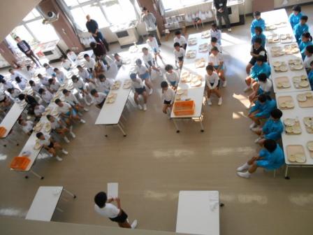 ↑5年生の児童が,今CMでも話題の「ライザップ」のものまねをしました。発表した本人は緊張したようでしたが,食堂はとても盛り上がりました。