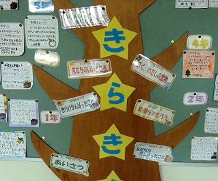 きらきらの木には、月毎にテーマを決めて、子どもたちの考えをきらきらの木の実として掲示しています。