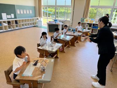 1年生が養護助教諭による歯みがき指導を受けていましたので、お伝えします。鏡をのぞき込みながら、ちゃんと歯ブラシが歯に当たっているかを確認しながら行いました。1本1本丁寧に磨くことを学びました。