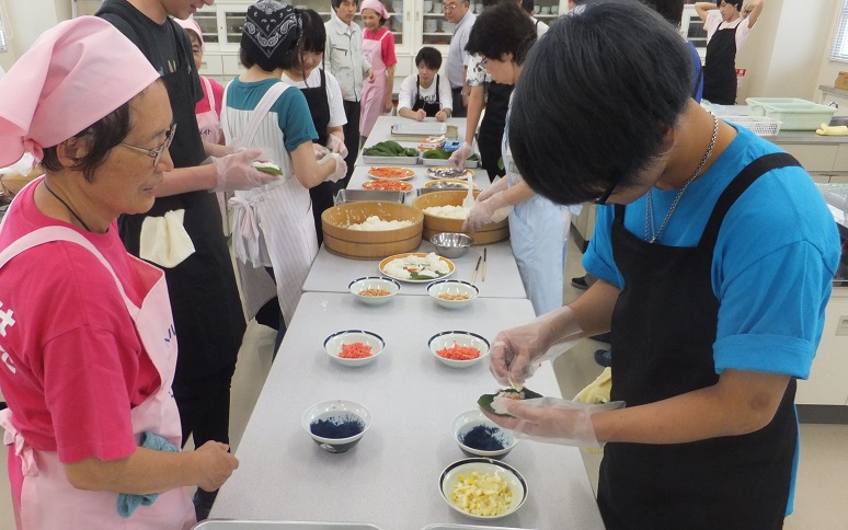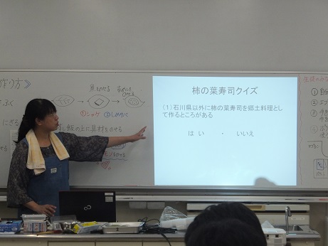 7月12日(木)、総合的な学習の時間を使って、全校生徒が「柿の葉寿司づくり実習」に挑戦しました。柿の葉寿司の作り方については、3人の大聖寺食生活改善指導員の方々に、懇切丁寧にご指導いただきました。