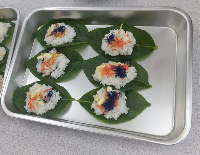 聖城生は錦城山プロジェクトの3つのグループ(自然・文化・歴史)に分かれ、とても和気あいあいと楽しく作業に取り組んでいました。〆さば・サーモン・紺のり・桜エビ・紅しょうが・レモンなどの食材をふんだんに使い、とってもおいしい柿の葉寿司ができました。