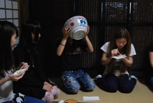 大きな茶碗を両手で抱えてやっとのことでいただく生徒たち。