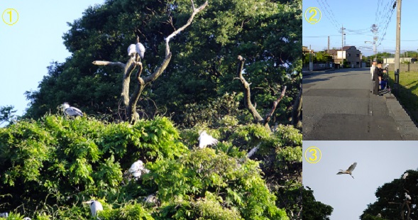 ① 今年のメンバーにとって初めての錦城山の鷺コロニーの観察をしました。