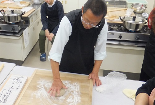 生徒が作ったのは、本格的な「二八そば」。4人一組のグループに、そば粉320g、小麦粉80g、打ち粉40g、水190gといった材料が割り当てられ、各グループは「水廻」「こね」「のし」「切り」などの工程に力を合わせて取り組みました。