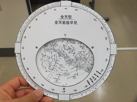 「月・星座の観察」は残念ながら雨のため中止になりました。代わりに講師の西谷重夫先生(元本校教諭)より、はやぶさⅡの活動についての講話をいただいた後、星座盤製作を行いました。