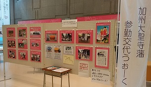 パネル展では、本校の総合的な学習の時間の活動や加州大聖寺藩参勤交代うぉーく2019についてご紹介しております。なお、(株)北國銀行様のご協力により、この後来年3月にかけて、市内各支店(山中・山代・動橋)においても順次パネル展示を行います。また、かが交流プラザさくら、JR大聖寺駅、加賀市立中央図書館等でも、随時展示会を開催しますので、どうぞ足をお運びください。