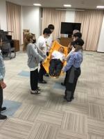 訓練後、3班に分かれて担架・毛布・車いすを使った搬送訓練を行いました。