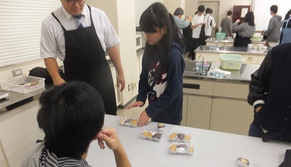 10月3日(木)、加賀市食生活改善推進協議会の3人の女性に講師を務めていただき、加賀の郷土料理「柿の葉寿司」づくりにチャレンジしました。色とりどりの具材を使用し、見た目にも美しい柿の葉寿司を作ることができました。