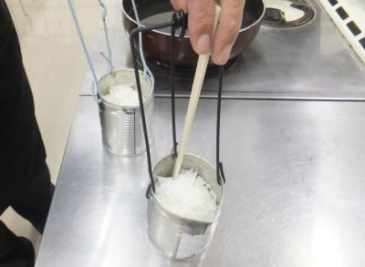 空き缶と針金で作った容器に粉状の蝋(ろう)