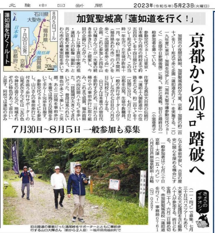 歴史探究活動「蓮如道を行く!」 投稿日時 : 2023/07/13 ICT支援員 『北國新聞』(5/12朝刊)、『北陸中日新聞』(5/23朝刊)にて、「蓮如道を行く!」についてご紹介いただきました。ありがとうございます。