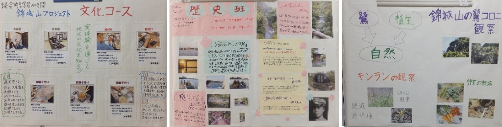 ふれあいホールでは、錦城山プロジェクトの中間発表、生徒作品等を展示しました。