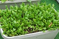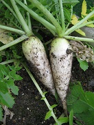 ホウレンソウは間引いておひたしで、 ダイコンも立ち上がり、白い足が見え始めました。
