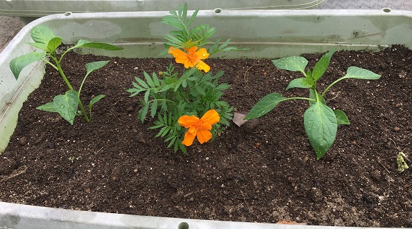 トマトやピーマンなどにはマリーゴールドを、ナスにはハーブのチャービルを植えました。